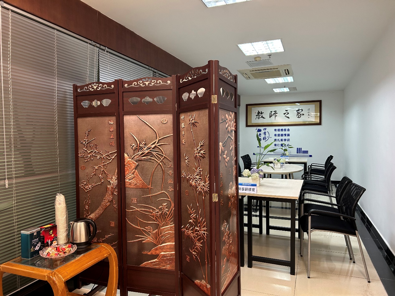“共享研修室”的开放,将为教师们的学术研修、小型学术研讨提供学习交流的场所,有利于方便教师日常交流与学习,营造更加良好的教师研修氛围,也为跨校区工作的教师提供了一个临时的学习场所。“共享研修室”按“实用”“简约”的原则进行陈设。采用可隔离式入口,为老师们研修准备了电源插座、WIFI接入等条件,还在研修区入口外设置了热水壶及茶叶、咖啡等饮品,并为有需要的老师,准备了白板。