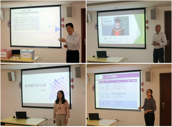 接下来,师资科科长吴志军以“翟天临事件”为切入点,聚焦学校博士后工作进展情况,从培养特色和运行机制上阐述了博士后科研流动站、博士后科研工作站和博士后创新实践基地的三轮驱动效应。师资科工作人员郑云帆细致交流了新闻稿写作方法和心得体会;高层次人才办工作人员王雯雯热情总结分享了自己从70余场重大会议组织筹备活动中凝练得出的“一个明确认知、两条工作原则、三个工作模块”的会议组织方法和“会前周密准备、会中眼疾手快、会后及时总结工作法宝。三位党员汇报结束后,分管处领导陈闰分别进行了精彩的点评。